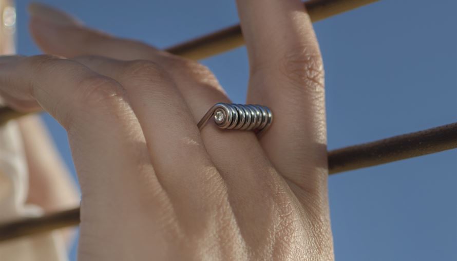 Le dita delle mani che danno vita alla creatività sono la molla che ha fatto scattare la linea Industrial. Un’attenzione quasi maniacale al movimento di quella parte del corpo che ci permette di plasmare e di esplorare ogni cosa si rivela prima nello studio dell’ergonomia degli anelli, che nonostante l’aspetto inusuale quasi non si sentono addosso grazie a un attento studio sulle forme e poi nella scelta dei modelli per i suoi gioielli.