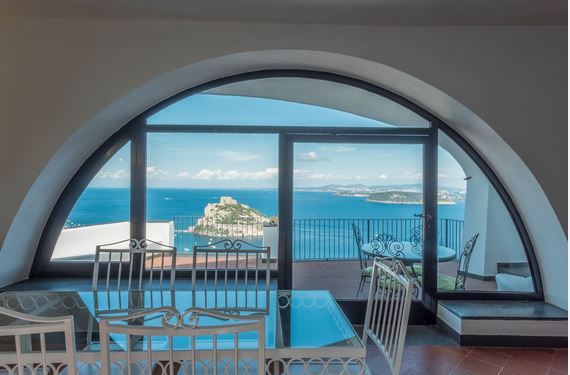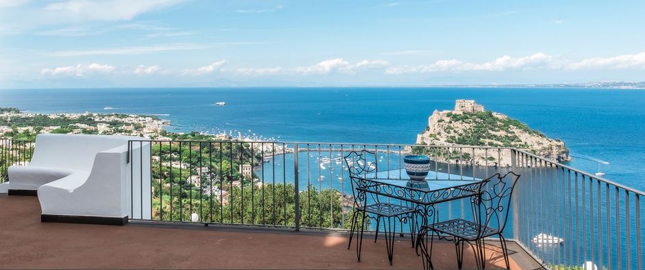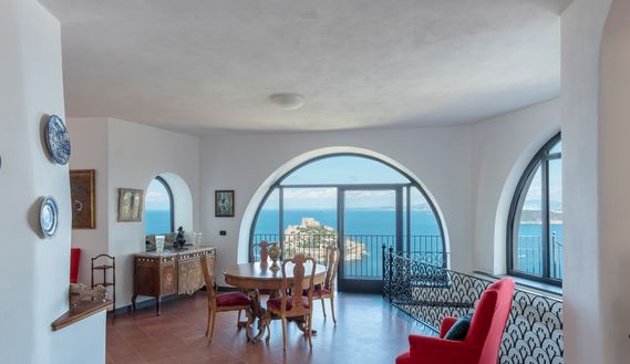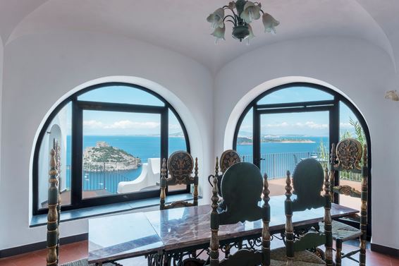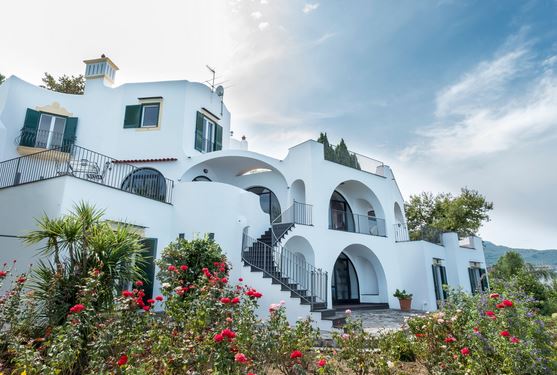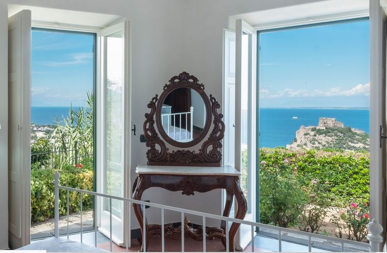 Con le sue forme morbide e armoniose, la proprietà si affaccia sullo spettacolo naturale del Castello Aragonese regalando da ogni ambiente scorci mozzafiato grazie alle grandi vetrate ad arco che fanno dialogare interno ed esterno. La villa si sviluppa su tre livelli, di cui il primo, indipendente, è composto da living con grande terrazzo, cucina e camera da letto e bagno. Una vera e propria “guest house”. Gli altri due piani costituiscono il corpo principale, con una suddivisione tipica delle ville di un tempo. Le camere, tutte con una splendida vista, accedono ad un meraviglioso giardino coltivato a rose.