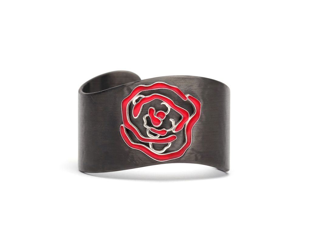Tra le opere esposte, Blooming Hope di Elena Donati si distingue per il suo forte significato simbolico. Il gioiello, una rosa in argento ed enamel rosso, rappresenta la rinascita e la forza interiore. Il bracciale in carbonio, materiale noto per la sua resistenza, simboleggia la determinazione di chi affronta il dolore e trova il coraggio di ricominciare. L’opera si inserisce perfettamente nel contesto della mostra, evidenziando il potere del gioiello di trasmettere emozioni profonde e significati universali.