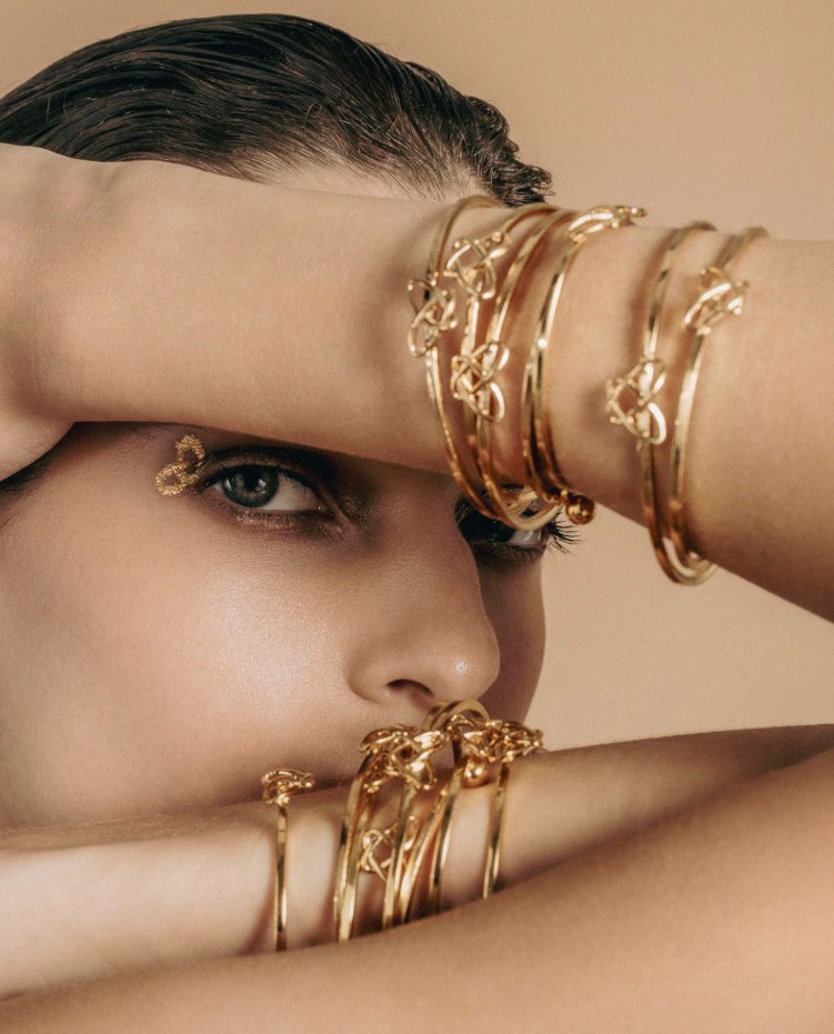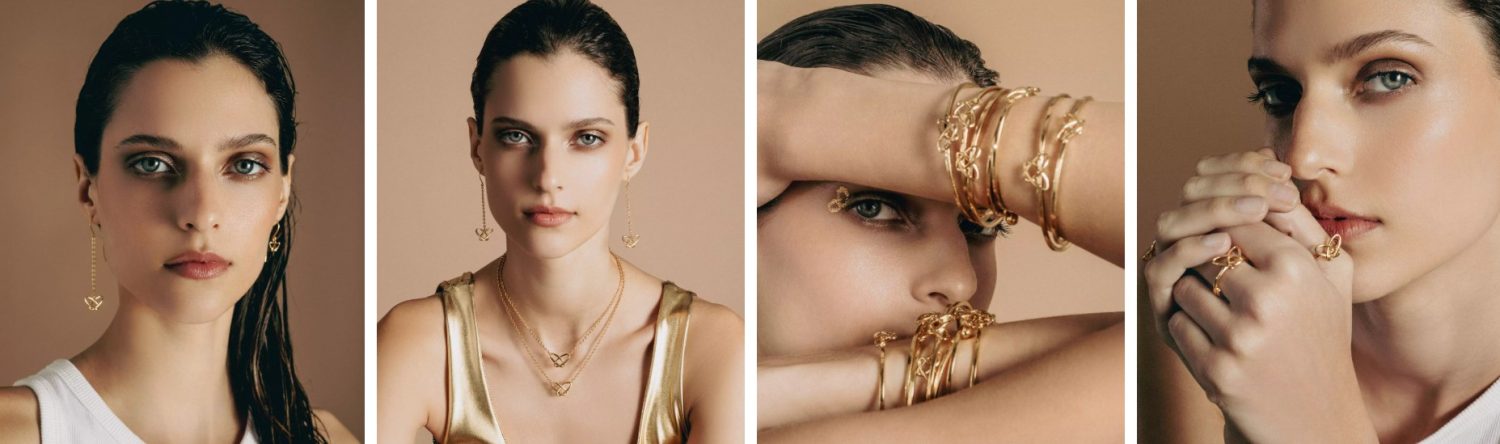 Realizzati in ottone bagnato in oro, tutti i pezzi della collezione sono regolabili e anallergici, garantendo il massimo comfort e versatilità. Il logo prende vita in un intreccio di linee leggere e armoniose, valorizzando la femminilità con un tocco sofisticato e moderno.