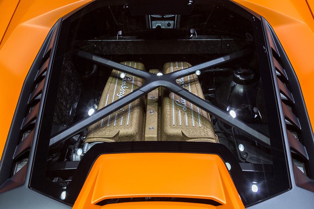 Il cofano motore integra le grosse prese d’aria e al centro si può intravedere attraverso un pannello di plexiglass il motore V10 la cui copertura è stata rifinita in bronzo per rievocare l’heritage Lamborghini.
