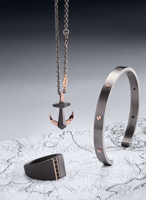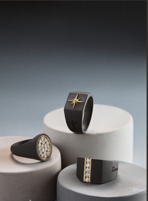 Al centro oggetti preziosi di Zancan (anelli in titanio della collezione Eterniry Titanium). A destra il bracciale simbolo della collezione Eternity Gold rappresenta un’evoluzione del design Ceramikgold, rivisitato in una versione esclusiva in oro 18k e arricchita da diamanti naturali.