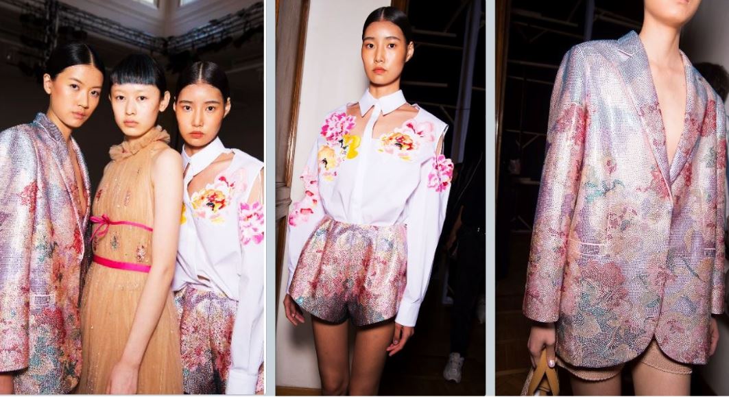 La designer Vivetta Ponti ha integrato 500.000 pietre Swarovski in una scintillante gamma di colori e tagli per coprire gli shorts all-over di cristalli, un completo in full- Swarovski e un abito lungo con i suoi motivi floreali.