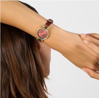 Un orologio in grado di far innamorare al primo sguardo grazie a dettagli unici e materiali preziosi come il cinturino in pelle nel colore geo map rouge, la cassa e il quadrante tondo impreziosito da eleganti numeri romani e sostenuto da due raffinate staffe tempestate di cristalli.