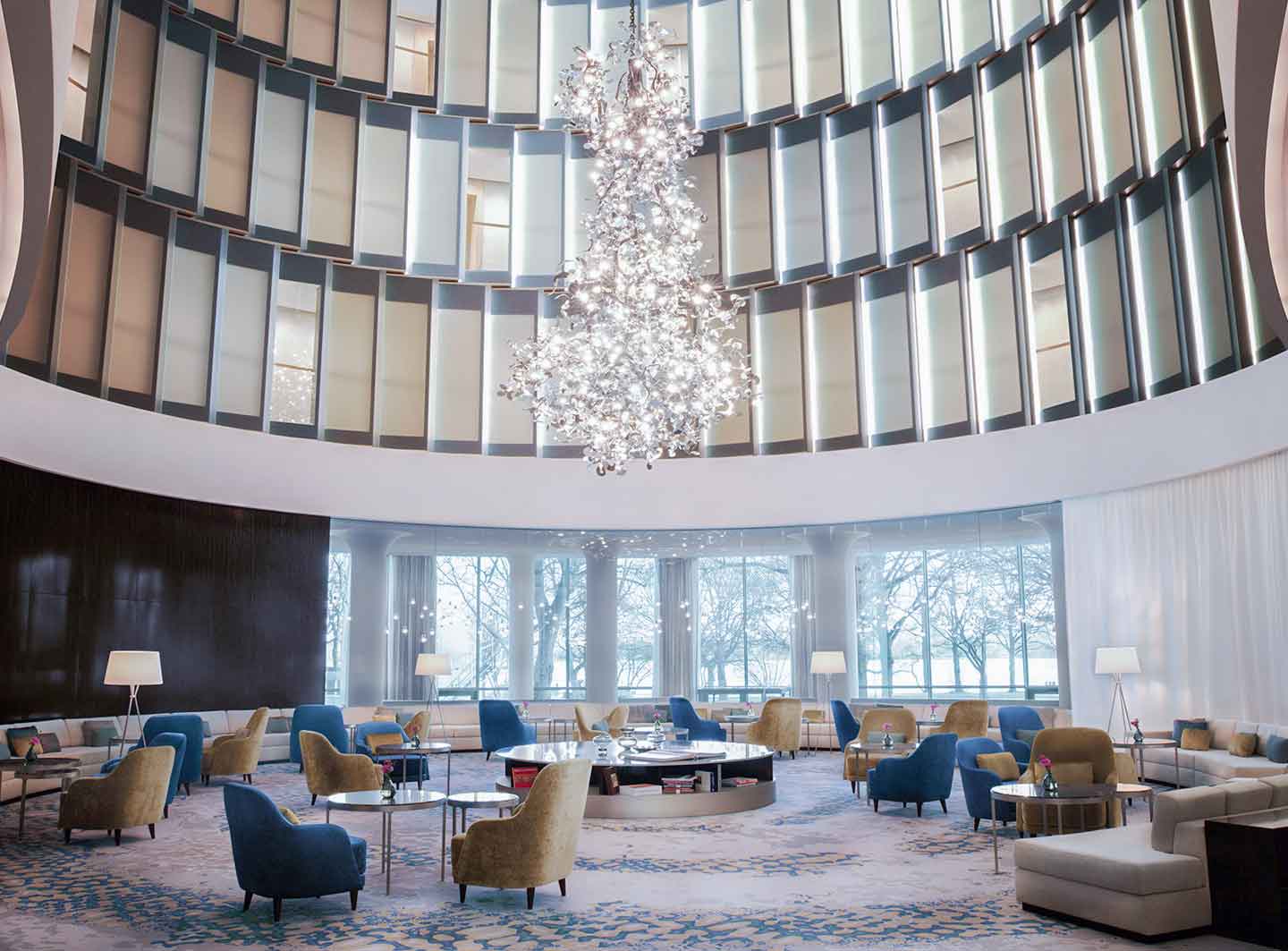 In tutto l’hotel, diverse suite hanno ricevuto un accattivante lampadario dalle collezioni consolidate. Lo studio di architettura “Störmer Murphy and Partners” ha dovuto affrontare una sfida tecnica importante per soddisfare i desideri di un pezzo di illuminazione nell’atrio: grazie alla costruzione dell’edificio, dispiegata da una cupola lisciata a stucco, era consentito un solo punto di sospensione.