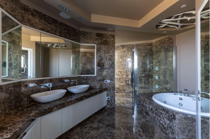 I materiali utilizzati prendono vita in un elegante rapporto tra modernità e tradizione del luogo che intreccia il pregio di pietra, marmo e legno alla contemporaneità di vetro, metallo e resine.