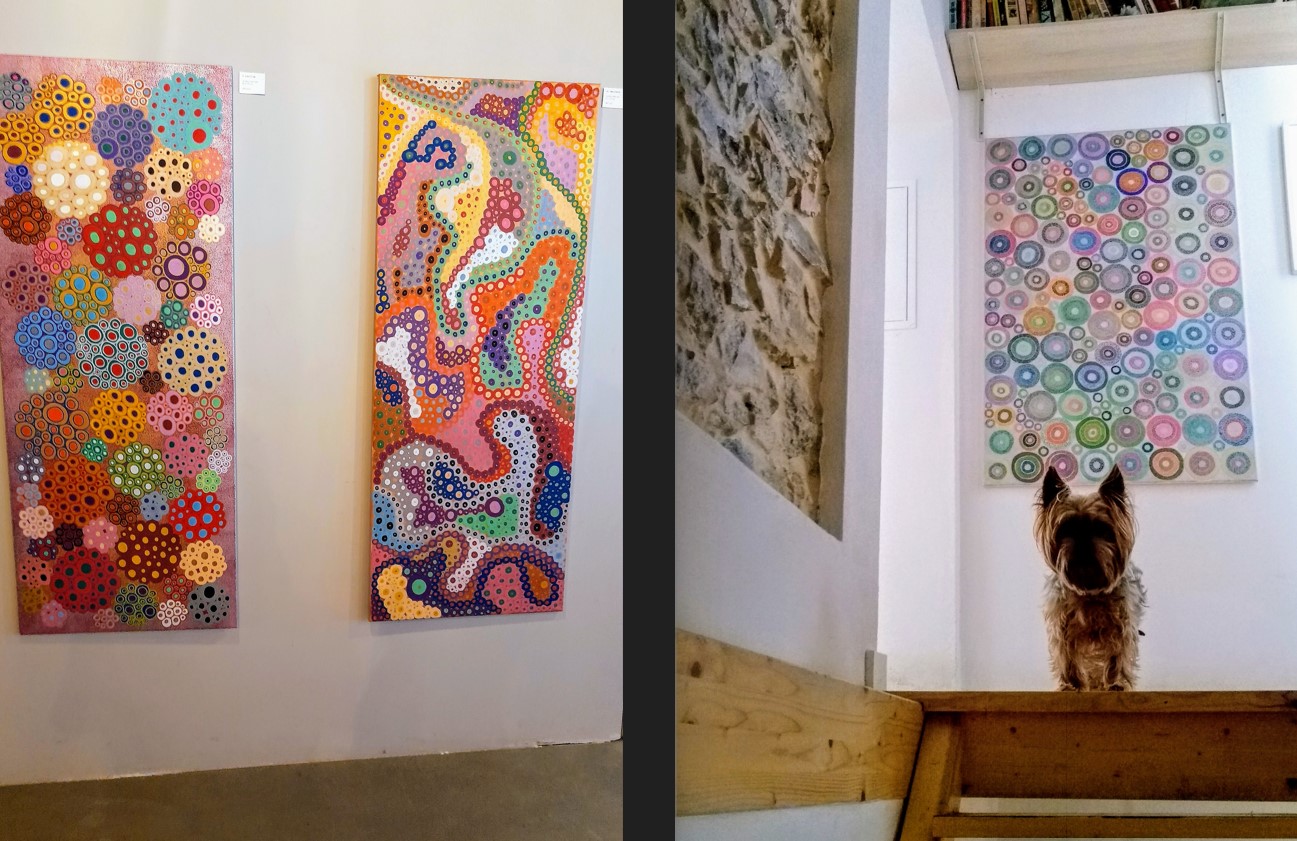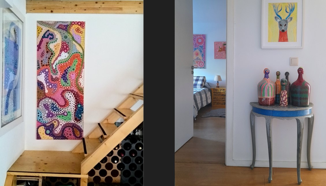 Le opere di Claudio Westphalen sulle pareti della casa e nell’atelier aperto alla verde della natura, sono puri elogi al colore, alle linee, alle macchie, a volte a piccole simmetrie, delicate del cuore. Il suo universo pittorico e scultoreo si rinnova ogni volta, giorno dopo giorno, seguendo gli stati d’animo e le sperimentazioni continue, lontano dal nuovo mondo oltreoceano da cui ha scelto di andare via per vivere e dipingere altrove i suoi immensi paesaggi dell’anima.