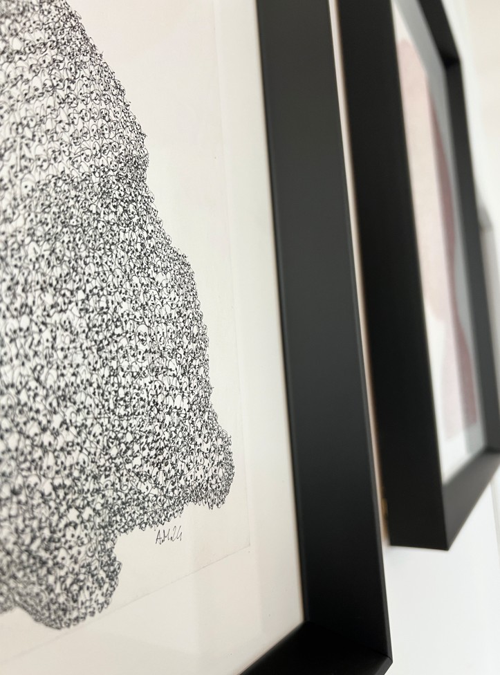 Dopo anni dietro l’obiettivo, Marchesin decide di abbandonare la fotografia per dedicarsi al segno e alla materia, avviando una ricerca più intima e viscerale. La mostra di quadri attualmente visibile a Tricolore Design Hub di Milano ne è una testimonianza. Sono opere, prevalentemente di grande formato che illuminano gli ambienti in cui si posizionano con un bianco spaziale riempito da dettagliatissimi ritratti, segni, ripetizioni che creano effetti ottici sorprendenti. La testimonianza viva e vivace di una virata artistica che è una svolta per Marchesin. “Ho iniziato a vedere volti ovunque — racconta — figure sospese tra vita e morte, come imprigionate in un limbo. Disegnarli è diventato un gesto necessario, fisico e mentale. Un modo per mettere ordine dentro di me.”