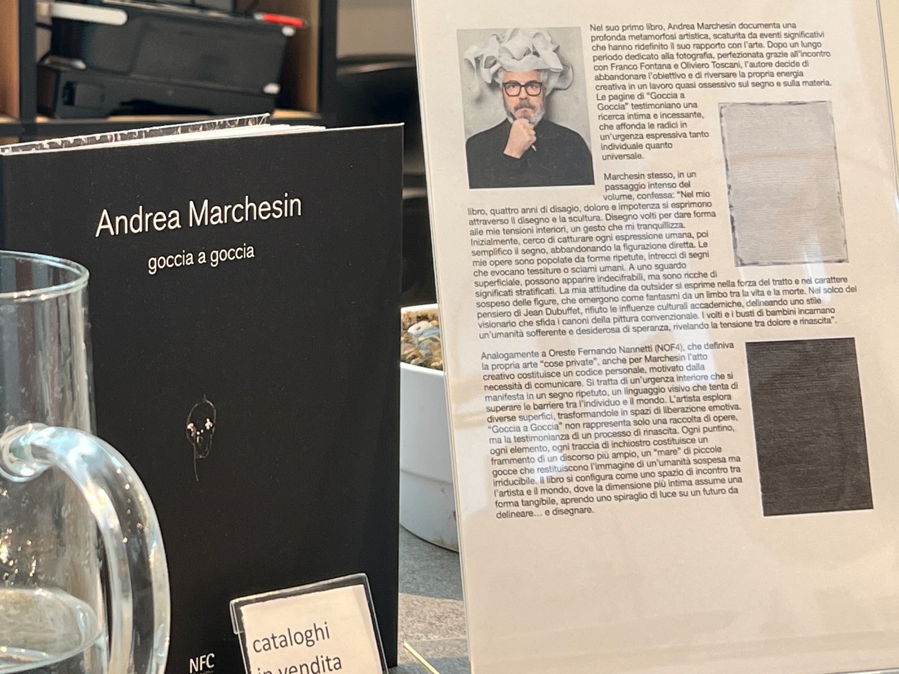 Come Oreste Fernando Nannetti, che definiva la sua arte “cosa privata”, anche Marchesin comunica attraverso un codice interiore, un gesto ripetuto e ossessivo che diventa ponte tra sé e il mondo. Ogni segno è un frammento di racconto, ogni opera una superficie da esplorare: carta, cartone, tavole, argilla e bronzo diventano campi di tensione emotiva, dove convivono caos e ordine, istinto e controllo.