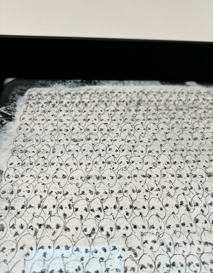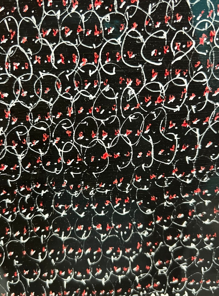 All’inizio, questa urgenza si manifesta attraverso un’esplosione creativa: ogni volto, ogni espressione viene catturata, conservata come testimonianza di un’umanità fragile e desiderosa di speranza. Poi, con il tempo, sente il bisogno di semplificare, di andare oltre un figurativo immediato e di abbracciare un linguaggio più criptico e meditato. Sono opere popolate da ripetizioni di forme, intrecci di segni che richiamano tessiture, membrane oppure minuscoli sciami di vita, tutte cariche di molteplici significati invisibili a prima vista.