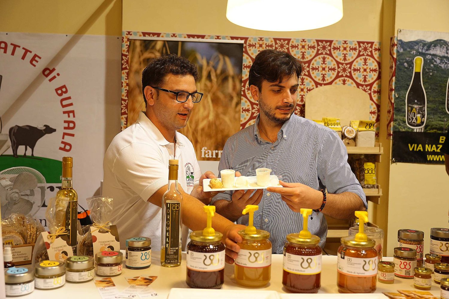 A rappresentare i prodotti a base di latte di bufala: La Dispensa di San Salvatore, con yogurt e cremosi, i primi certificati blockchain; il Caseificio Lettieri, con un’intera gamma di prodotti di bufala, e la ricotta servita in versione dolce con zucchero e topping di pistacchio e cioccolato. Il Caseificio Pucciarelli produttore di formaggi a pasta filata, di pecora e capra, tra cui il cacioricotta di capra cilentano stagionato. In degustazione anche la “mozzarella nella mortella” di Angelo Iannuzzi. Spazio anche all’olio con la linea Stilla di Agrioil Italian Farm e Oleum, Associazione Assaggiatori olio di oliva. Interessante anche la scelta dei vini: la Cantina Cilento, con 10 cantine del Consorzio Vita Salernum Vitae: Alfonso Rotolo, De Conciliis, Polito, Tempa di Zoe, Lunarossa Vini, Guerritore Vini, Rossella Cicalese, Cobellis, Donna Clara, San Salvatore, Azienda Agricola Natalia Magnoni, Tenuta Palaios. Poi Tenuta Conti di Anghirri con il Tocula 700 e Tocula 575; l’Azienda Agricola Scairato, con vini ottenuti da uve di Castel San Lorenzo e Felitto. Alessandra Srl di Acciaroli (Pollica) è una piccola, che coltiva Primitivo in biologico.