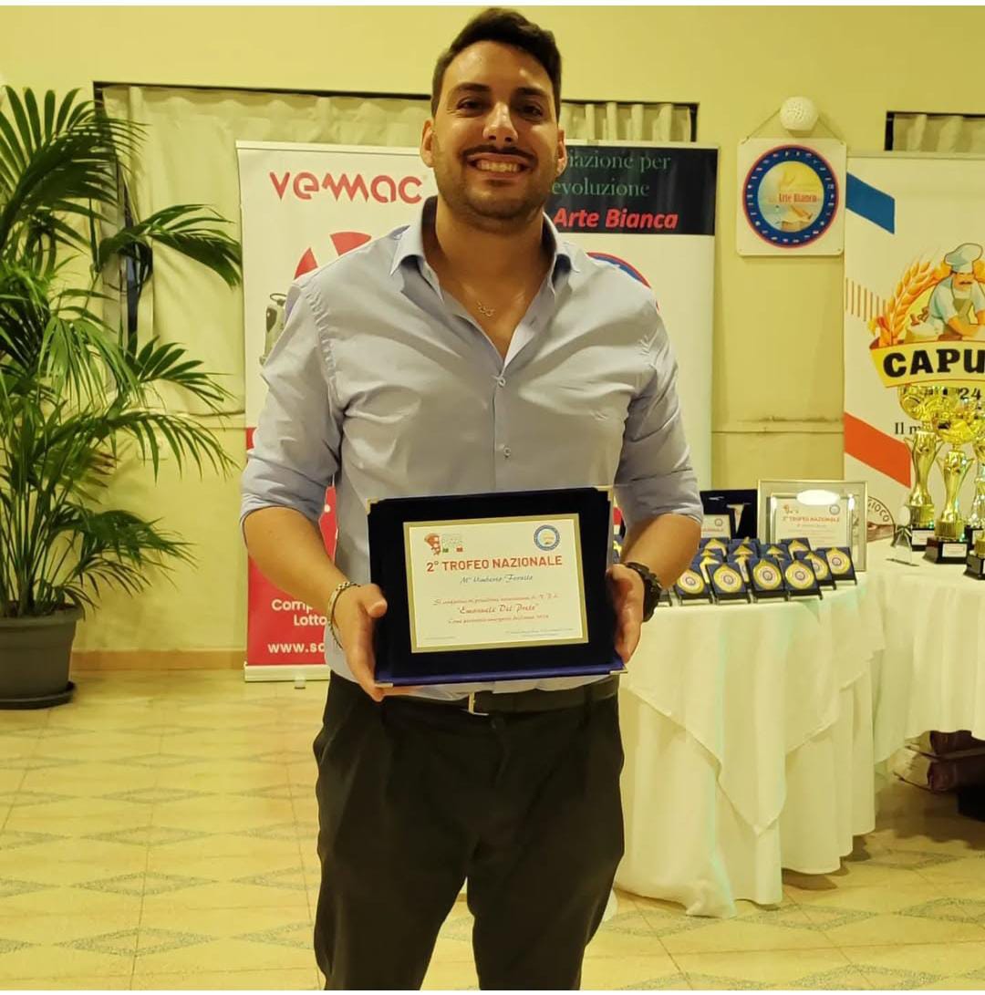 I concorsi sono stati per Emanuele Del Prete anche un modo per confrontarsi con l’esterno, con un panorama sempre più in rapido cambiamento: “Già ho dovuto prendere coraggio ad assumermi la gestione dell’attività da mio padre, che ora è in pensione. Poi l’avvicinarmi al mondo gare mi ha lanciato in un altro ambiente. Nel 2023 sono arrivati i primi premi importanti, ho conosciuto il pizzaiolo Umberto Fornito che mi ha fatto entrare nell’Associazione Arte Bianca. E l’anno scorso proprio per loro sono stato eletto pizzaiolo emergente”.