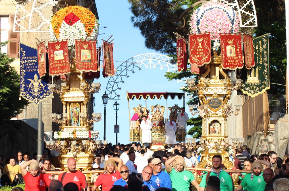 Altra festa popolare molto sentita nel Catanese è Sant’Alfio a Trecastagne, che cade il 10 maggio. Da ogni parte dell’isola dalla notte precedente arrivano persone a piedi vestite di solo fascia rossa e mutande bianche in segno di devozione. Indosso hanno un torcione, candela ad altezza uomo, che deve essere pari al peso del devoto. Un’occasione unica per fotografare una tradizione secolare. E il momento dell’esposizione dei tre santi fratelli, Alfio, Filadelfo e Cirino, è un’esplosione di gioia. La tradizione vuole l’esposizione della treccia d’aglio che viene consumata durante un anno. Anche qui c’è un segno distintivo nell’abbigliamento: gli uomini indossano il cappello di paglia.