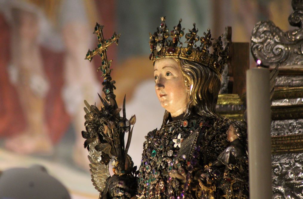 La santa è rappresentata da un busto reliquiario che ha un migliaio di gioielli addosso di varie epoche storiche che sono stati donati dalla nobilità nei secoli. La croce in petto è del monsignor Giuseppe Francica-Nava di Bondifè, arcivescovo di Catania. La corona è un gioiello di 1370 grammi tempestato di pietre preziose, donato da re Riccardo I d’Inghilterra detto «Cuor di Leone», che giunse in Sicilia nel 1190.