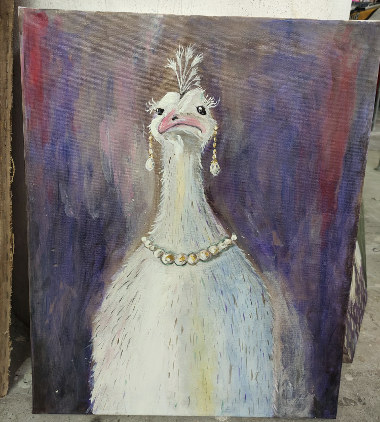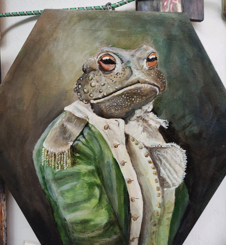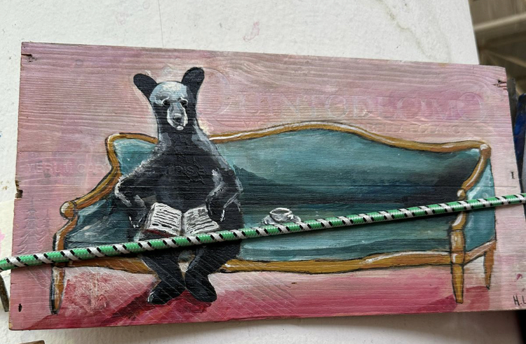 Il ritratto di un orso intento a leggere, seduto su un grosso divano verde, con a fianco una tazzina di caffè ci incuriosisce: Hélène allora ci racconta di aver lavorato all’e-commerce di un’azienda vinicola e di aver deciso di dare nuova vita alle tante cassette di legno che venivano buttate via; nasce così Orso Gigi triste (acrilico su legno, 2019) che, sotto il rosa che fa da sfondo al protagonista, tra le venature del legno, ancora lascia intravedere la stampa a fuoco del marchio vinicolo.