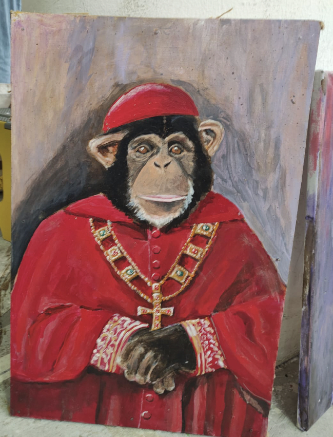 Appoggiata al pilastro dello stallo 615 del padiglione 3B troviamo quindi Iselda di Rocca Tomasi (acrilico su legno, 2020) una gallina con orecchini e collana di perle; oppureMonsignor Nocciolina (acrilico su legno, 2019) un’austera scimmietta simpatica in abiti da cardinale, che di sottecchi sbircia gli avventori