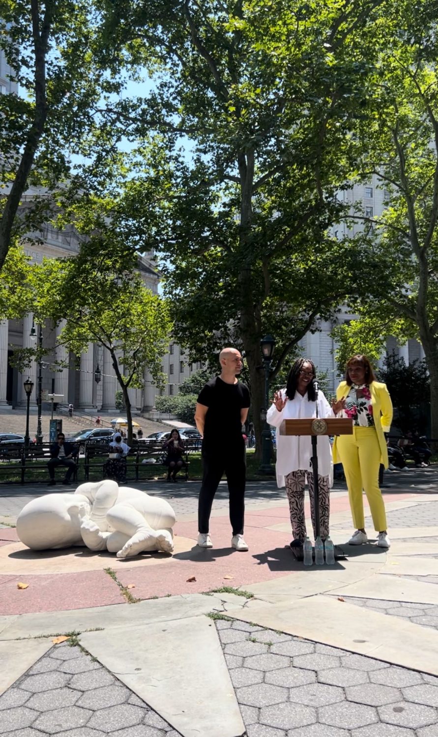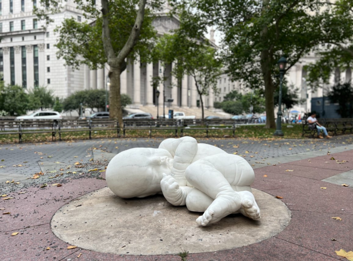 L’artista italiano Jago, l’icona Whoopi Goldberg e alcuni membri delle istituzioni locali hanno svelato ieri la nuova scultura in marmo “Look Down” a Thomas Paine Park a New York. La grande scultura in marmo di un bambino addormentato è stata ispirata dalla visita dell’artista a New York nel 2018, quando Jago è stato attratto dai senzatetto che dormivano per strada.
