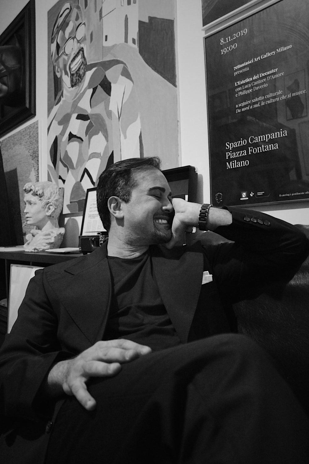 Sin dalla pubblicazione del suo primo romanzo, Luca Cantore D’Amore, 32 anni, salernitano d’origine e milanese d’adozione, si è diretto a un lato particolare della vita. Nelle pagine de “L’estetica del decanter” (Il Papavero, 2019), il critico d’arte e storico tratta dell’ineffabile e sfuggente forza delle emozioni. Incontrare e ascoltare gli stati d’animo e le ragioni del giovane intellettuale è innegabilmente affascinante. Luca ha un eloquio forbito e imprevedibile, è pronto a fornire la sua versione del mondo a chi lo ascolta senza piglio impositivo. Un vero cultore della parola, quella di peso. Che convince, proprio come quando è riuscito a portare l’arte contemporanea a Il Prisma, lo studio di architettura internazionale a via Adige a Milano, che oggi è uno scrigno di preziosi confronti periodici di alto valore culturale. Lì Marco Nereo Rotelli presenterà nel corso dell’anno una serie di allestimenti artistici a cura di Luca Cantore D’Amore.