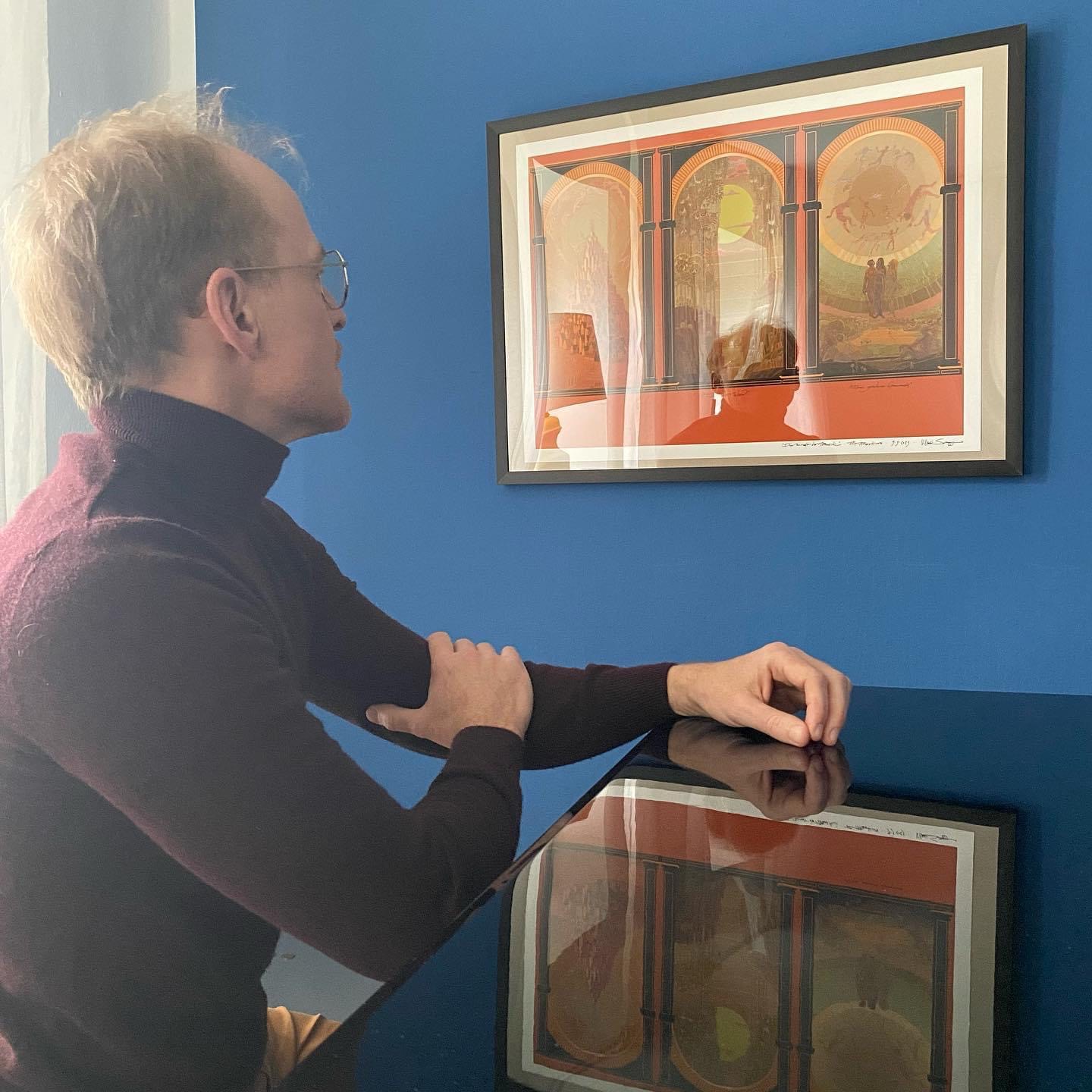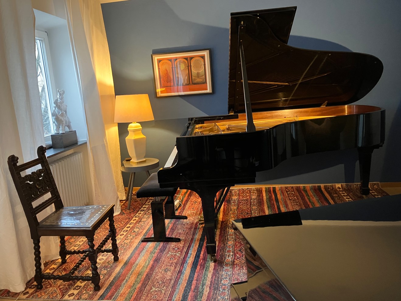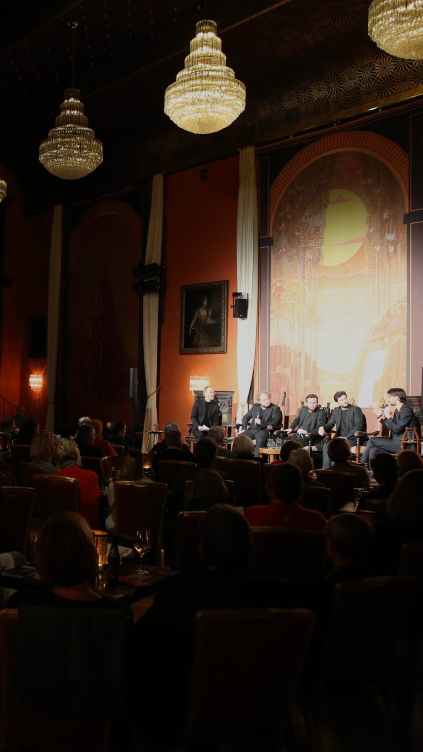 Quattro volte per stagione di concerti incontro musicisti di spicco nella più bella sala da concerto di Monaco: la “Münchner Künstlerhaus” che si trova nel cuore della città bavarese. La sala da ballo viene trasformata in un salone da opulenti dipinti del grande pittore Klaus Soppe. (Una versione in miniatura di questi dipinti è l’unico quadro appeso nel mio studio). “Parlo ai miei ospiti dell’importanza della musica e insieme suoniamo musica dal vivo”.