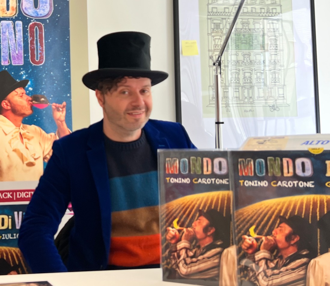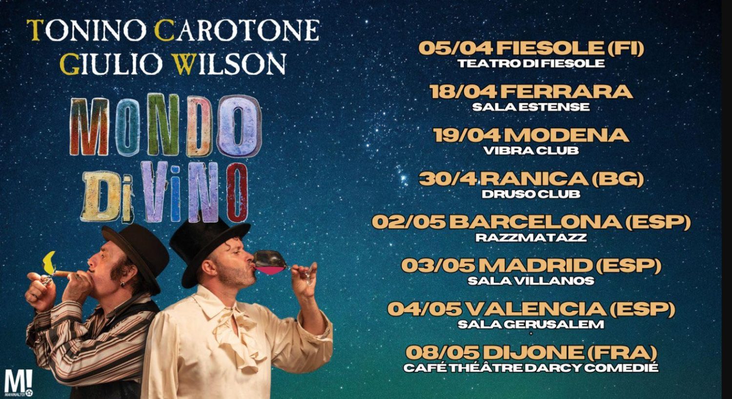 Anticipato dai singoli “Mamá” e “Mia Bella Ciao”, “Mondo DiVINO” è un album che nasce da un incontro tanto inaspettato quanto naturale. Dopo aver esplorato per anni il repertorio italiano degli anni ’50 e ’60, Tonino Carotone ha sentito il bisogno di immergersi nel cantautorato contemporaneo. L’incontro con Giulio Wilson, che oltre a essere produttore e cantautore è anche enologo e proprietario di una fattoria in Toscana dove produce vini biologici e colleziona auto d’epoca, ha dato il via a una collaborazione spontanea, nata tra le vigne della Toscana e maturata nel tempo, proprio come un grande vino.