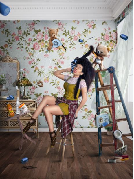 Importo la mia foto su Photoshop e ritaglio. Parallelamente, in un altro file, comincio a comporre la mia scena con un assemblaggio di sfondi, ritagliando oggetti trovati su Internet o che ho fotografato … Poi importo la mia immagine ritagliata in questo file e proseguo la composizione aggiungendo luci, ombre. Posso cambiare il colore dei miei vestiti…. Tutto questo processo richiede molto tempo, a volte dalle 10 alle 15 ore.