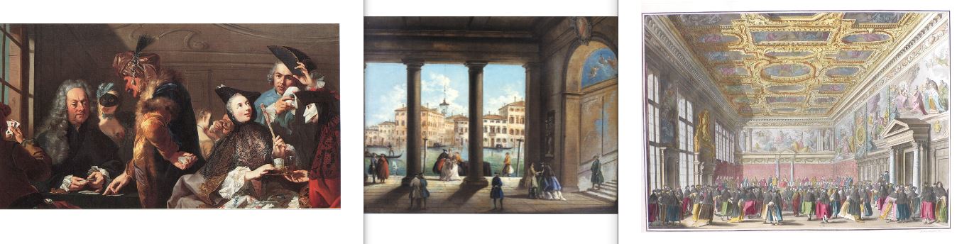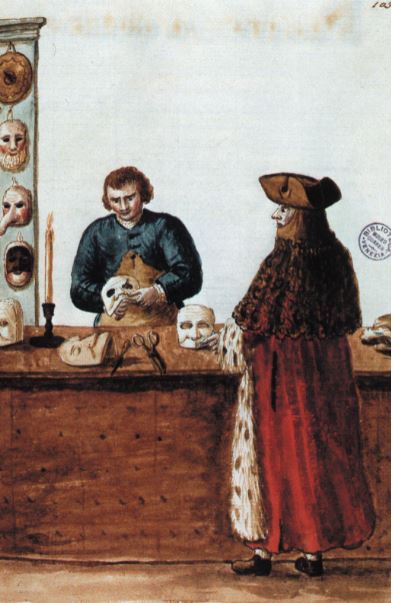 - le maschere che hanno origini nel teatro, nella Commedia dell’Arte. Le più famose sono Arlecchino, Pantalone, Pulcinella, Balanzone, il Capitano, Colombina e pochi altri che si declinano nelle tradizioni regionali. Queste maschere venivano molto usate a Venezia nel dare alla luce una sorta di show business ante litteram: molto prima che esistessero dei teatri veri e propri, i teatri stabili, Venezia esistevano impresari che organizzavano spettacoli per mercanti e pellegrini di passaggio;