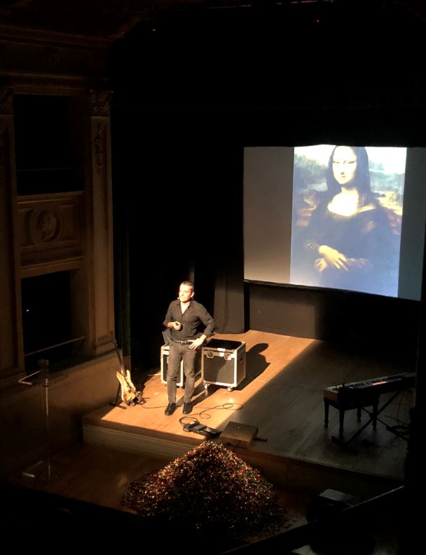 “L’arte è una caramella” ha la regia di Gianmarco Montesano, che oltre a essere uno scrittore è un artista in prima persona. Da quando abbiamo debuttato qualche anno fa, qualche aggiustamento l’abbiamo fatto ma è essenzialmente una cavalcata di mie esperienze raccontate tracciando una linea di quello che ho imparato. Poi ho degli strumenti, perché la musica è un’altra passione per me. A volte serve per comprendere le altre arti. La cosa più difficile ma anche più naturale è far capire allo spettatore che io non sto recitando un copione ma metto in scena me stesso con la passione che ho per l’arte. Dietro ogni parola che dico c’è uno studio, una considerazione profonda. Le persone lo capiscono e lo avvertono.