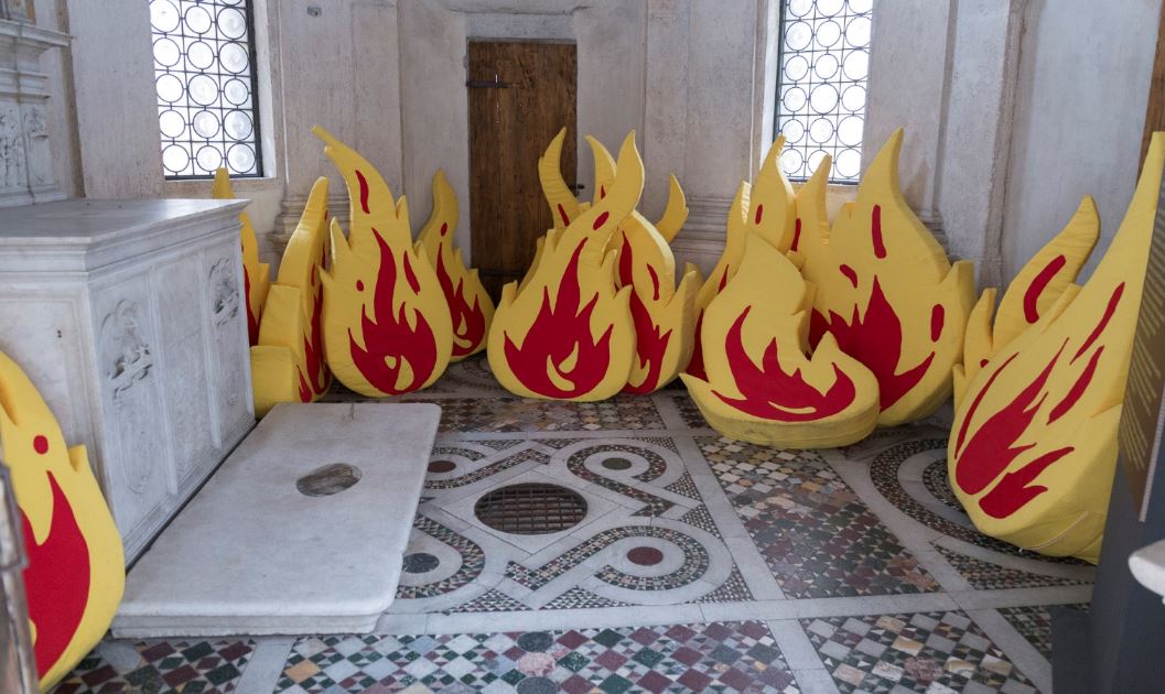 Quelle che vedete in foto sono le fiamme in gommapiuma esposte fino a qualche giorno fa a Roma, create dall’artista che voleva “creare un mondo più comodo alla portata di tutti”, iniziando dagli spazi comuni e dal nostro stesso patrimonio culturale e artistico.