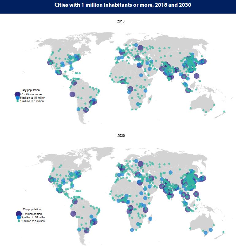 Le città del mondo stanno crescendo sia nelle dimensioni che nel numero All’inizio del secolo, nel 2000, c’erano 371 città con 1 milione di abitanti o più in tutto il mondo. Entro il 2018, il numero di città con almeno 1 milione di abitanti era cresciuto fino a 548 * e nel 2030, si stima che 706 città avranno almeno 1 milione di residenti.