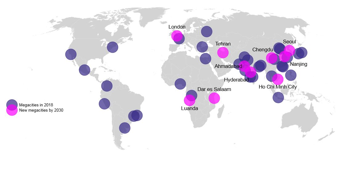 Le città con più di 10 milioni di abitanti sono spesso definite “megalopoli”. A livello globale, il numero di megalopoli dovrebbe aumentare da 33 nel 2018 a 43 nel 2030. Nel 2018, 48 città avevano popolazioni tra 5 e 10 milioni. Entro il 2030, 10 di questi sono destinati a diventare megalopoli. Le proiezioni indicano che 28 città aggiuntive supereranno i 5 milioni di marchi tra il 2018 e il 2030, di cui 13 in Asia e 10 in Africa.
