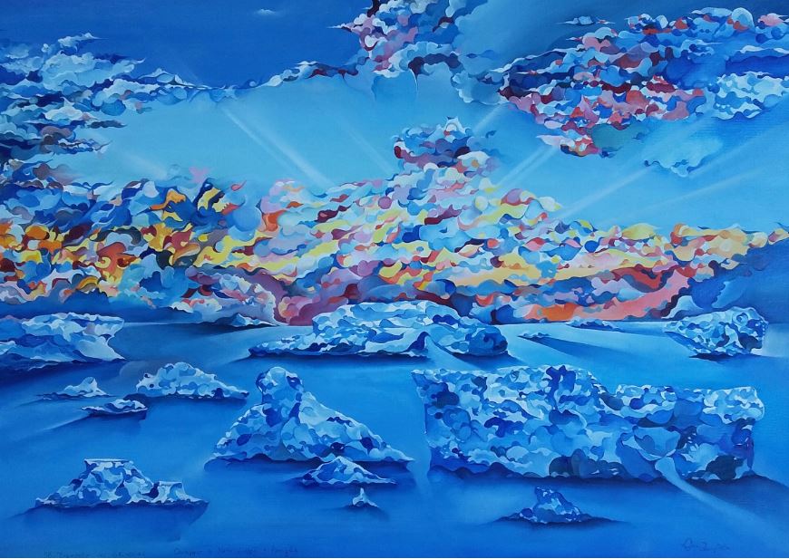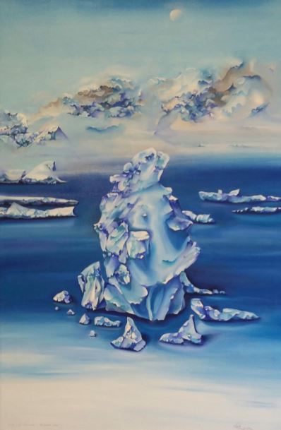 “Lasciato solo” rappresenta il primo incrocio tra condizione umana e naturale nei miei quadri. A primo impatto è il paesaggio a dominare la vista. Poi arriva il secondo piano di lettura, che è provare a decifrare i messaggi all’interno della rappresentazione. Se ben si scorge, c’è un volto di un anziano che guarda i ghiacciai che sono i suoi famigliari. Questa è una mia protesta contro chi lascia i grandi da soli. Ho immaginato la natura come le persone anziane, i ghiacciai come i nostri vecchi, sono fonte inesauribile di acqua potabile che può svanire in pochi anni. Ce ne dobbiamo prendere cura.