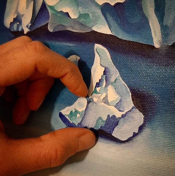 Tutto è partito con la serie “Assenteismo”, inteso come assentarsi dal mondo circostante, mi appassionava il mondo del mircoscopio, volevo creare una specie di puzzle a livello artistico. E da lì ho creato e rappresentato dei soggetti che potessero manifestare i problemi non solo ambientali ma anche sociali. Erano astratti, mi servivano come escamotage simbolico per sensibilizzare sui problemi ambientali. Poi ho avuto un vuoto artistico e ho iniziato la serie dei ghiacciai nel 2018. Per fare il primo quadro ci ho messo nove mesi. Pensa che all’inizio avevo pensato a rappresentare un fenicottero e poi mi sono dedicato a indagare su un ambiente che conosciamo poco per parlare del problema dei cambiamenti climatici e della sostenibilità.