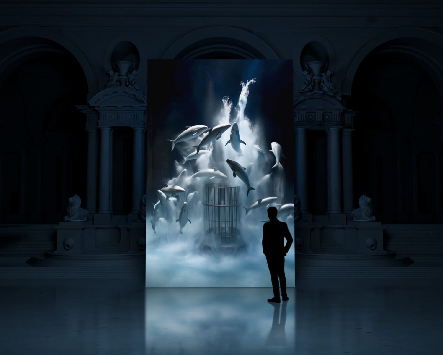 A inaugurare questo spazio è “Liturgica”, l’opera creata da Giuseppe Lo Schiavo con il supporto della Gen AI: un’installazione immersiva che propone un viaggio visivo simile a un’allucinazione. Immagini, ritratti di animali, materia e corpi si susseguono e si trasformano in un flusso liquido senza fine.