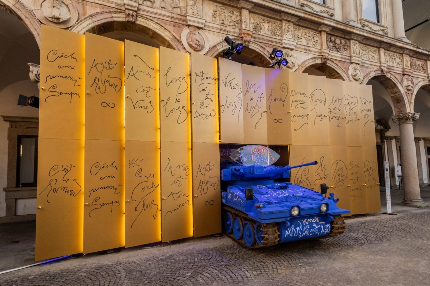 L’opera dell’artista, il cui lavoro vi avevamo presentato qui, raffigura un grande portale, formato da 46 porte verniciate d’oro, le cui superfici sono decorate con versi poetici sui concetti dell’amore. Questo grande sfondo d’oro si fonde con un carro armato dipinto di blu, in una metamorfosi che lo trasforma in un “carro a(r)mato”, non più espressione di guerra. “L’installazione vuole essere un paradosso, una provocazione, dove arte e design si uniscono per portare un messaggio di pace”, sottolinea Celia Stefania Centonze, partner di Ever in Art, società che ha prodotto il concept. “Sulla soglia, spazio reale e metaforico, si svolge infatti una metamorfosi: il portale diventa un varco, un luogo di passaggio verso un mondo migliore, dove l’amore vince la guerra, vince su tutto”.