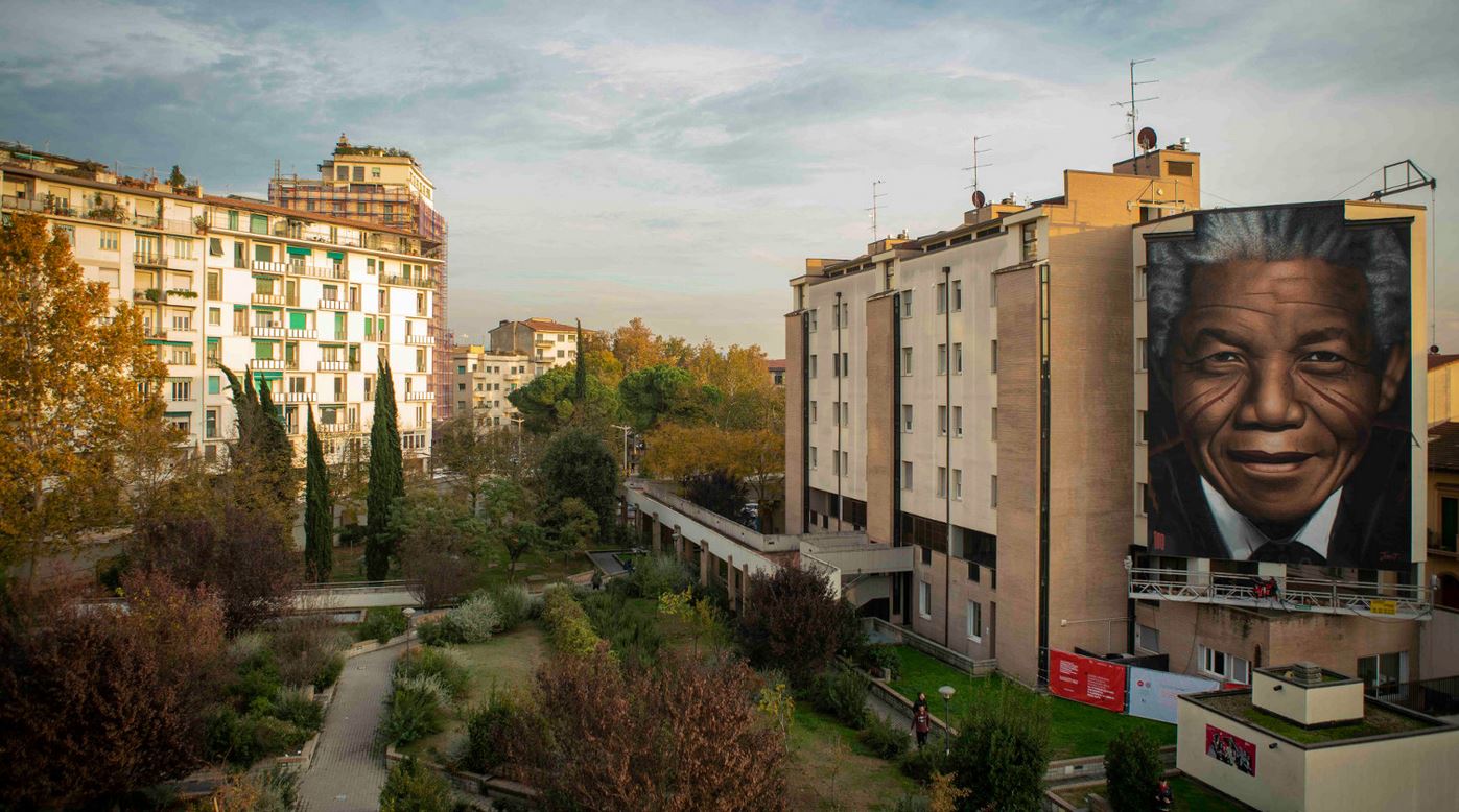 Al Premio Nobel per la Pace, Firenze dedica il grande murale “Nelson”, realizzato dalla street-artist Jorit sulla parete di un edificio di quattro piani di residenza popolare in piazza Leopoldo, ribattezzato Condominio dei diritti.