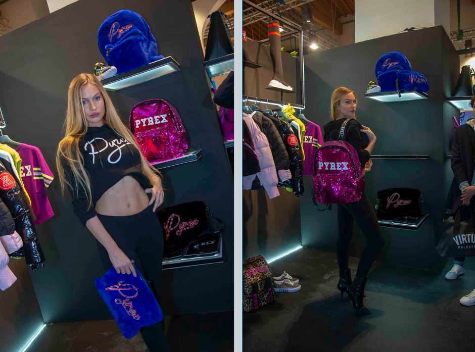 TAYLOR MEGA è invece stata ospite dello stand PYREX per la collezione A/I 19. A Pitti Uomo 95, la modella ha illustrato con la sua presenza il mondo paillettato delle borse fashion che piacciono alle giovanissime.