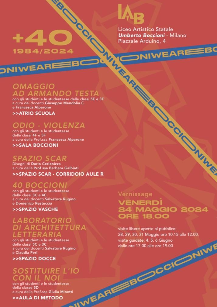 Il tessuto umano e artistico di quarant’anni di vita studentesca giovanile, hanno riempito le aule del liceo artistico “Umberto Boccioni”, di Milano: milioni di passi ne hanno calpestato i corridoi, tessiture di infinite voci, sono risuonate tra le sue pareti. È la magia di un luogo unico e speciale che si chiama “scuola”, che vibra in modo unico, perché si erge, di anno in anno, a custode dei sogni più magici, quelli legati alla gioventù. Così, il “Boccioni”, il 24 maggio apre la sua preziosa cassaforte e soffia 40 candeline.