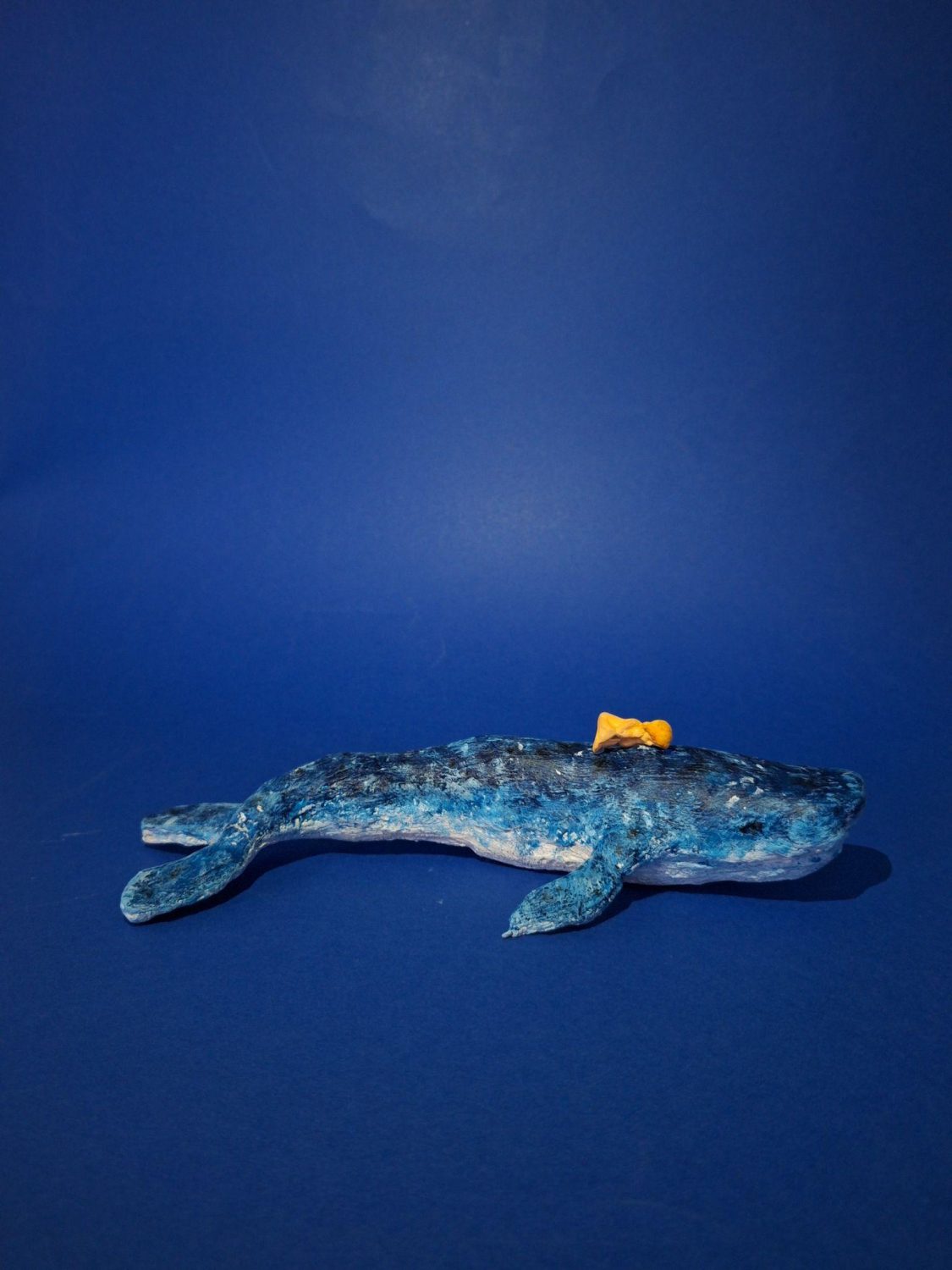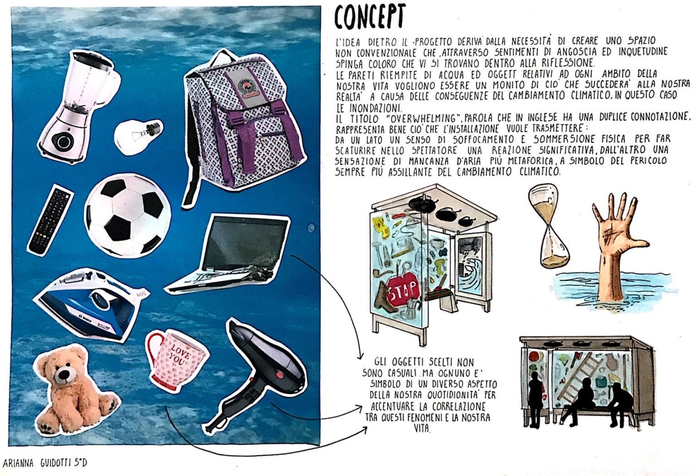 L’architetto Giulia Minetti in “aula Metodo” con le studentesse e gli studenti della 5^ D ha creato il progetto “E SE FOSSE TUO FIGLIO?” . L’obiettivo è fare immedesimare lo spettatore sulla pericolosità che le nostre azioni producono sul cambiamento climatico. Il protagonista principale dell’opera, è l’animale più grande al mondo, la balenottera azzurra, più precisamente un cucciolo, che rappresenta la parte da accudire, proprio come il cucciolo d’uomo, il bambino. L’installazione è composta da questi due personaggi principali, il cucciolo di balenottera azzurra e il bambino, entrambi agonizzanti, con il suono di sottofondo, attraverso suoni interattivi, del canto delle balene, delle onde che si infrangono sulla spiaggia, del pianto straziante del bambino. Sono presenti delle percezioni interattive tattili, possibili attraverso la texture che risulta verosimile, grazie all’uso di resina e vetro riciclati per rendere il tutto iper-realistico.
