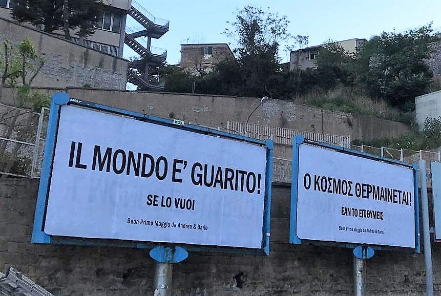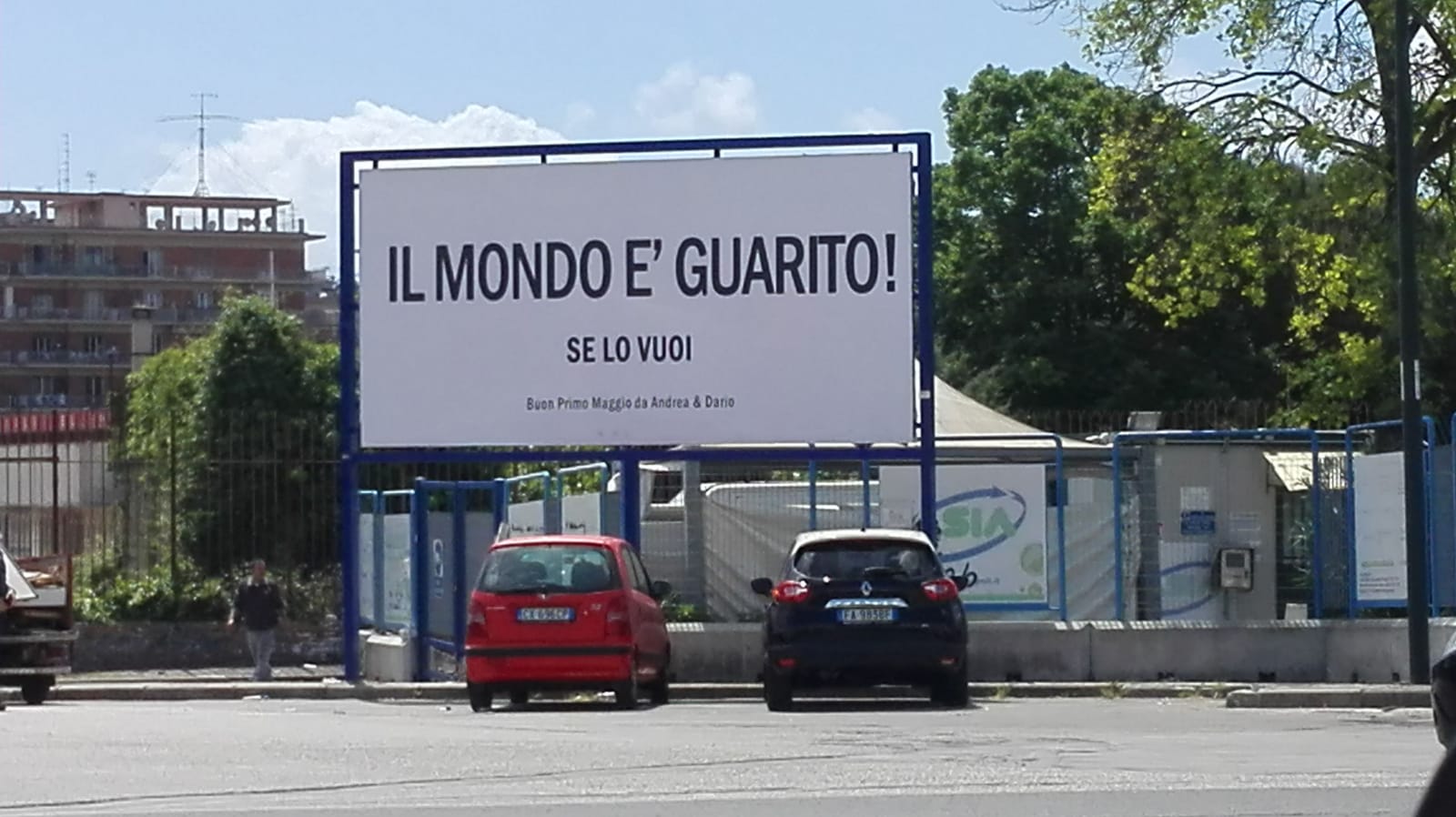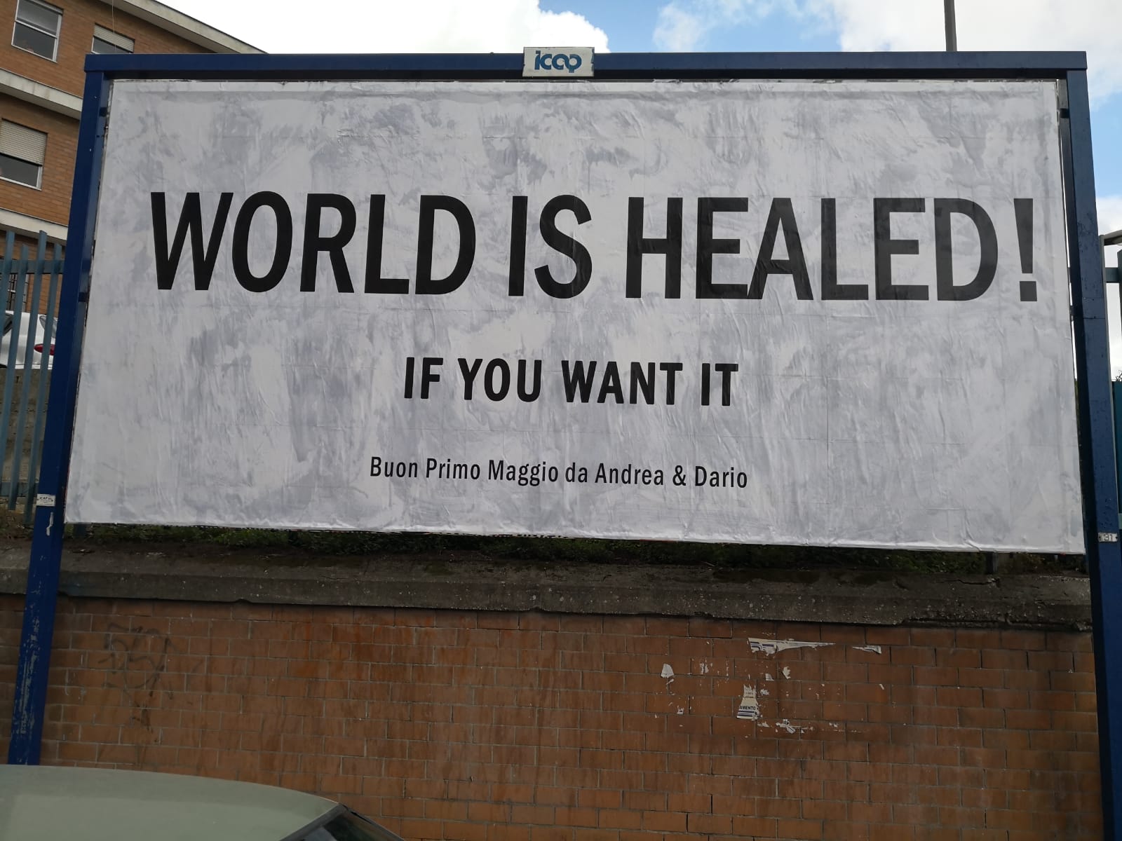 Da alcuni giorni grandi manifesti in formato 6 metri per 3 metri di chiara ispirazione ‘lennoniana’ si inseguono lungo le strade di Napoli: due professionisti napoletani, i fratelli Andrea e Dario Raguzzino, hanno così lanciato il loro messaggio “IL MONDO E’ GUARITO! SE TU LO VUOI” (“WORLD IS HEALED! If You Want It”).