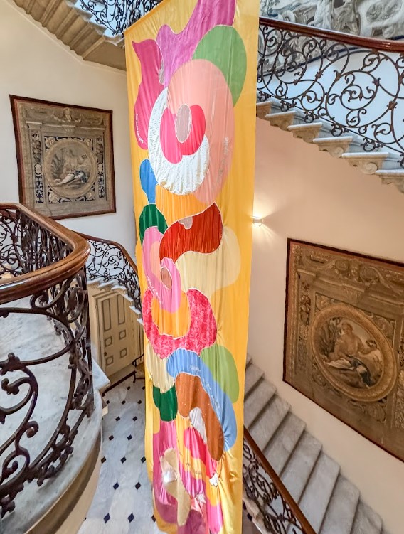 Dal 6 all’8 dicembre 2024 (in occasione di Saatchi Late, che si terrà proprio il 6), sarà possibile ammirare l’imponente opera tessile, delle dimensioni di 10mx3m, esposta sulla scalinata della Saatchi Gallery e visitabile gratuitamente. “Senza Tempo” si ispira a una poesia palindroma di Lonardi, dove le parole si rincorrono sia verso l’alto che il basso ed è arricchita da ricami a mano in chiffon, organza, velluto e seta e rifinita con applicazioni in oro e argento; i colori rosso, rosato e bianco, con accenni di verde e blu, evocano sia i colori del vino che il paesaggio dei vigneti.
