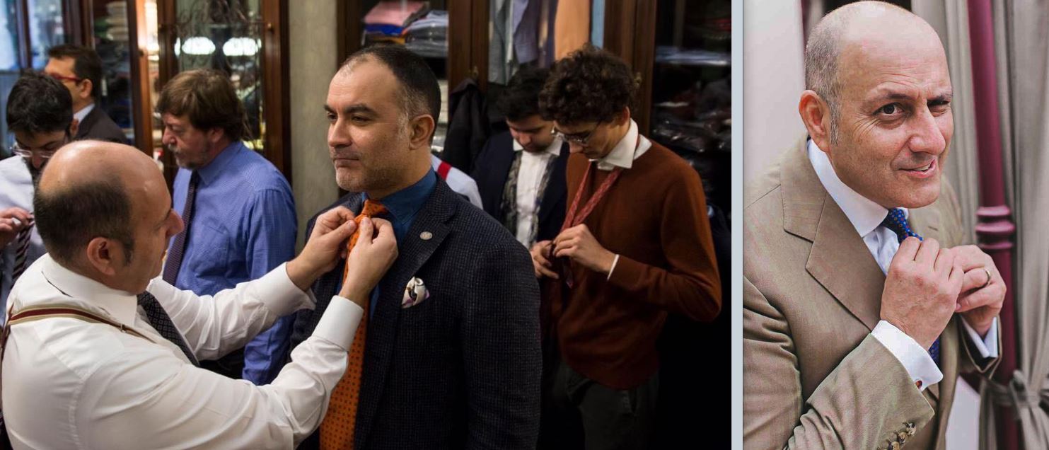 Ancora la passione è molto debole, mentre l’interesse è forte. Il tutto è nato quando avevo 18 anni per colpa di mio babbo, napoletano verace che davanti allo specchio mi insegnò a fare il nodo alla cravatta, non il più semplice ma lo «scappino». Ricordo ancora, doppio petto blu, pantaloni grigi, camicia blu e scarpe nere. Era un capodanno e con i miei amici decidemmo di vestirci eleganti per fare bella figura con tutte le ragazze invitate alla festa; comunque, tornando al nodo scappino, mi piacque da subito per la sua simmetria. Con il passare del tempo iniziai ad approfondire la conoscenza dei nodi fino a quando nel 2015, durante un viaggio verso Udine, l’amico Alberto Salvadori mi propose di fare un tutorial sui nodi alle cravatte. Per quell’occasione scrissi un manualetto e feci una dimostrazione pratica ai miei compagni di viaggio. Mi divertii moltissimo tanto che da quel momento iniziai a realizzare dei tutorial in giro per l’Italia. Brand molto rinomati mi accolsero a braccia aperte e di volta in volta aggiornavo per le varie occasioni il mio manuale tascabile sui nodi delle cravatte.
