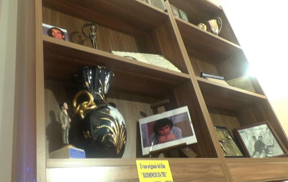 “Qui c’è Massimo” dice il fratello e le sue parole sono al presente. Ogni oggetto parla della sua vita personale e della sua carriera professionale. Foto ricordo, ritratti e souvenirs provenienti dai vari set dei suoi film. Su di una mensola un vaso. Il famoso vaso di quando Massimo tentava di muoverlo solo con la mente. La famosa bicicletta de ‘Il Postino’ con berretto ed il borsone poggiati sul manico sinistro. La locandina dello stesso film tratto dal libro dello scrittore cileno Antonio Skarmeta: ‘Ardente Paciencia’ tradotto con il titolo ‘Il postino di Neruda’. In un angolo fanno bella mostra di sé alcuni strumenti musicali che lo stesso attore teneva non per sé ma per gli amici che lo andavo a trovare. “Amici come Renzo Arbore, Riccardo Cocciante e Pino Daniele ed erano occasioni anche per la creazione di nuove idee”.