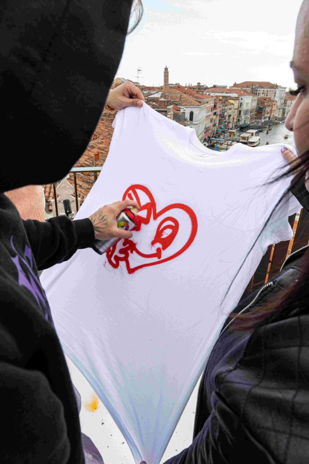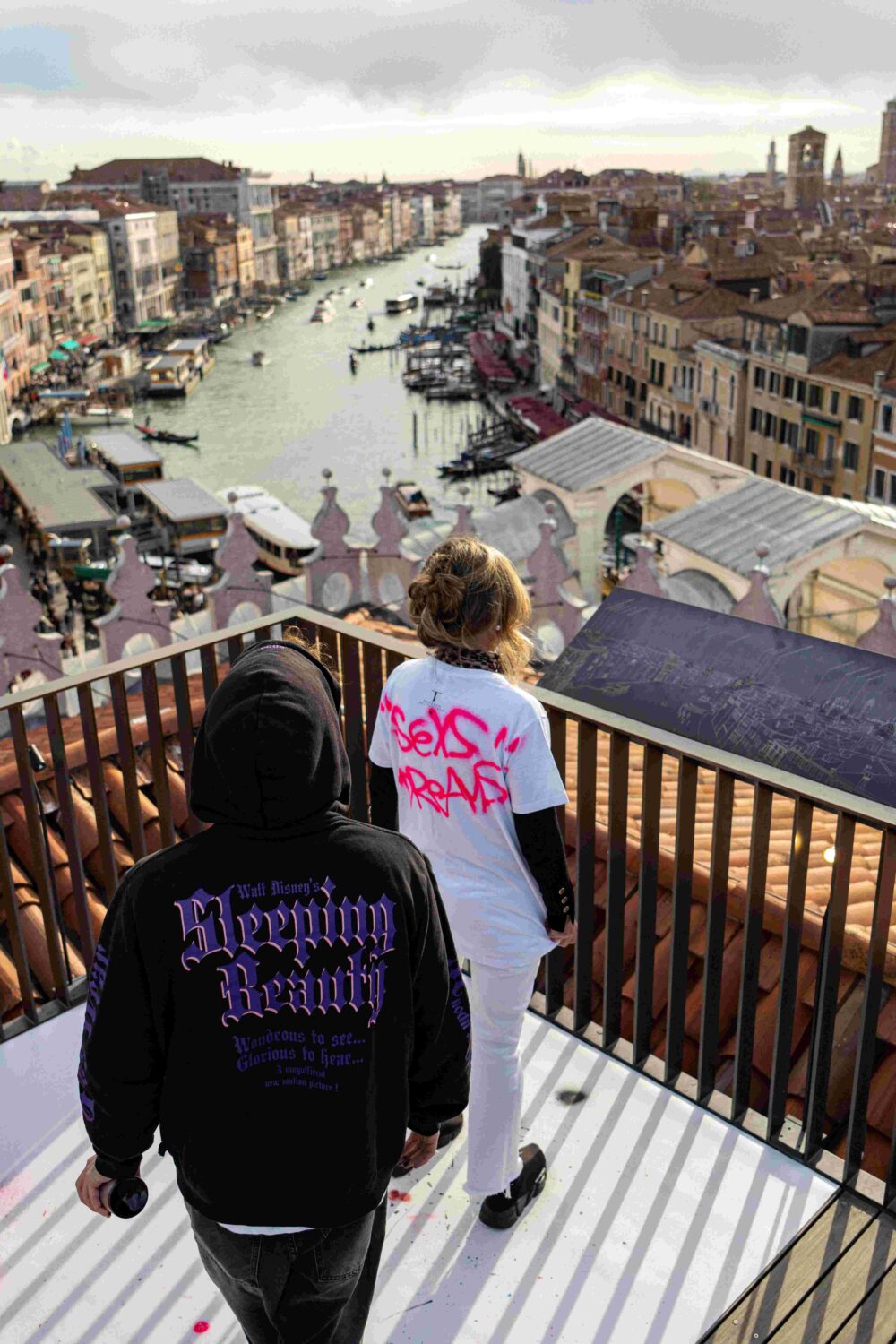 Una performance artistica dal vivo sul meraviglioso sfondo di Venezia, che ha visto la street art in maniera non convenzionale, incontrando la moda per evidenziare uno stile coinvolgente e personale.