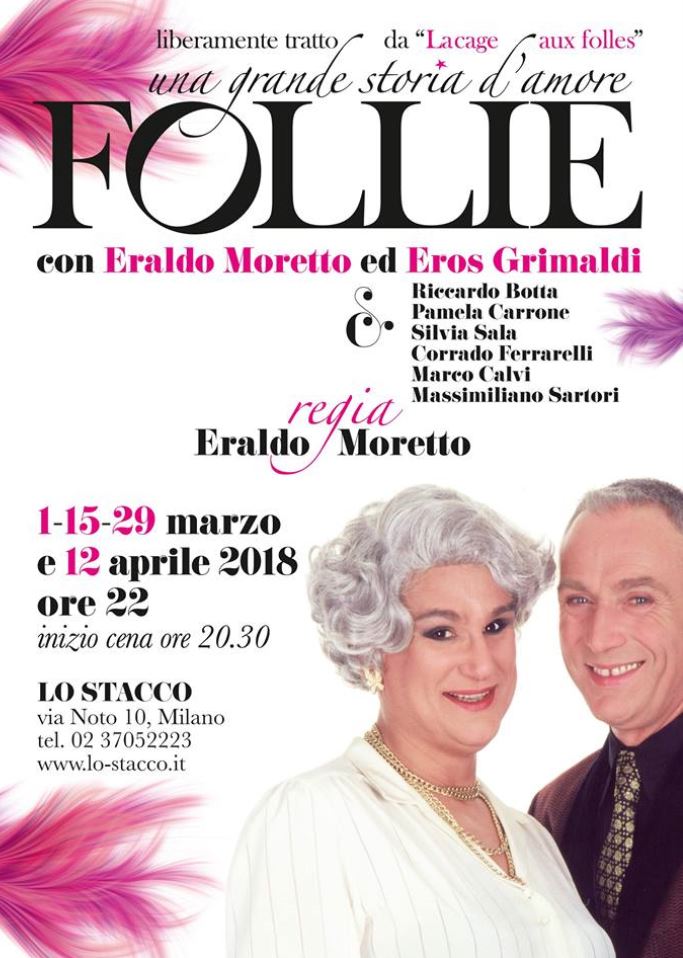 Giovedì 1 marzo alle ore 22.00 (inizio cena alle ore 20.00), a Lo Stacco (via Noto 10 Traversa di via Ripamonti), nel contesto del programma “CenaTeatro”, è di scena Follie, liberamente tratto da: “Il Vizietto” con Eraldo Moretto ed Eros Grimaldi, che a loro modo reinterpreteranno “La Cage aux folles”, pièce teatrale di Jean Poiret, messa in scena nel 1973 e poi adattata per il cinema in uno strepitoso film di Édouard Molinaro con Ugo Tognazzi e Michel Serrault.