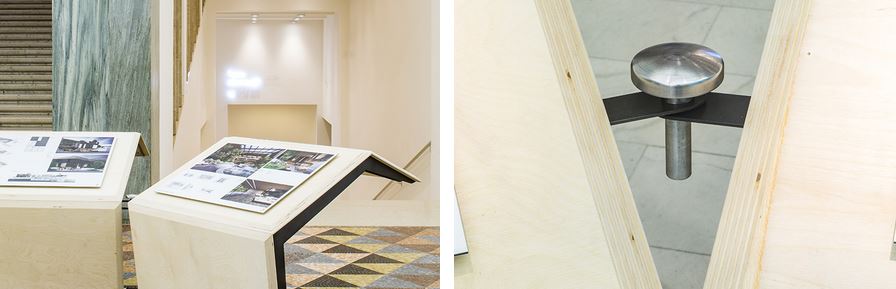 Gli espositori bifacciali dispongono di un doppio piano inclinato, per una lettura rapida e sintetica all’esterno e calma e approfondita all’interno. Il risultato è un percorso dinamico e continuo, di circolazione e di sosta, attraverso il quale i visitatori potranno conoscere e approfondire le proposte e il profilo dei cinque team di progetto, oltre allo straordinario contesto entro il quale sorgerà il Centro termale.