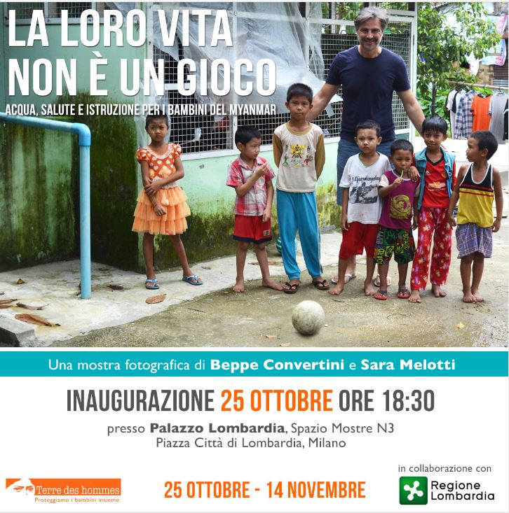 Terre des Hommes Italia, in collaborazione con la Regione Lombardia, organizza la mostra dal titolo “LA LORO VITA NON È UN GIOCO Acqua, salute e istruzione per i bambini del Myanmar“. L’esposizione, allestita presso la Sala Espositiva N3 della regione Lombardia a Milano dal 25 ottobre al 14 novembre 2018, si lega a doppio filo con gli interventi predisposti dalla Fondazione sul territorio birmano.