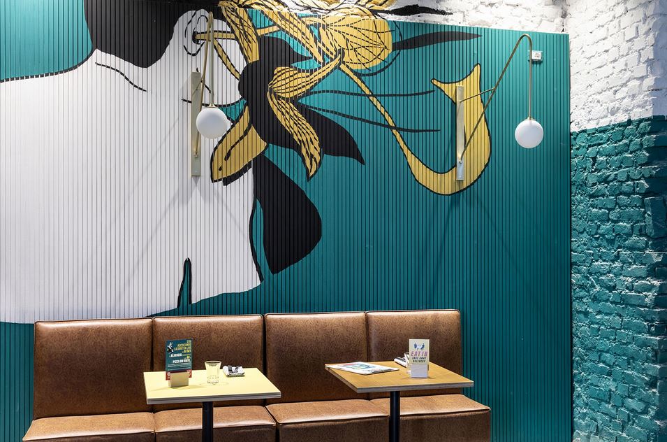 Il nuovo locale nei pressi della stazione centrale ospiterà 120 coperti in un ambiente completamente ristrutturato con l’obiettivo di valorizzarne le volumetrie originali. L’intonaco è stato eliminato per dare luce al mattone grezzo. L’utilizzo di colori pop e vivaci a contrasto con il mattone dipinto di calce bianca vede anche l’inserimento di una lunga striscia verde intenso come boiserie. Non poteva mancare il wall-painting, elemento presente in tutti i locali dell’insegna. Riprende per il terzo locale milanese la collaborazione con con le visual artists TO/LET, già autrici delle opere presenti nei locali bolognesi, a Firenze San Frediano e a Torino, che nel nuovo locale milanese ridisegnano un ambiente onirico, un giardino acquatico in cui fluttuano suggestive creature anfibie. Le grafiche del locale ripropongono lo stile Berberè, caratterizzato da un immaginario vintage con foto in bianco e nero montate, con la tecnica del collage, su colori accesi e vividi.