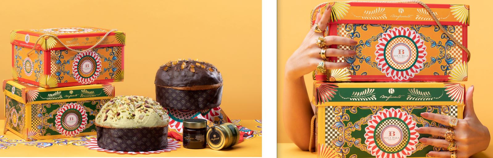 Sono i toni accesi del verde del pistacchio, delle foglie di limone e dell’arancione delle arance siciliane, illuminati dal color oro – esplicito richiamo al gioiello – a caratterizzare le cromie delle due scatole le cui tonalità sono anche un richiamo ai due gusti dei panettoni. Pistacchio e limone, con una glassa di cioccolato al pistacchio, pistacchi interi e canditi di limone e un vasetto di crema di pistacchi di Sicilia, è il panettone siciliano delle feste. Cioccolato di Modica e Arancia glassato in superficie con cioccolato fondente, dolci canditi di arancia e golosi pezzetti di cioccolato di Modica IGP, con vasetto di crema di cioccolato di Modica per arricchirlo ulteriormente, è dedicato a chi ama il cioccolato. Le scatole Isola Bella Gioielli e la tovaglietta americana – esclusiva idea regalo che unisce insieme moda e palato – possono essere utilizzate, anche dopo le festività, come complementi d’arredo belli e funzionali con cui arricchire le proprie case o uffici.