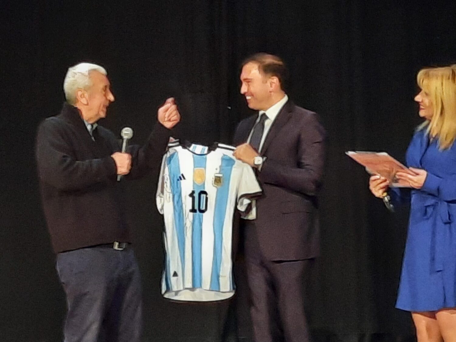 Al centro della serata, l’intervista con l’indimenticabile Evaristo Beccalossi, moderata per l’occasione da Christian Gaston Illan che ha dialogato con la leggenda che ha fatto la storia del calcio. Come si vede in foto, l’imprenditore italo-argentino ha voluto omaggiare il campione con una maglia della nazionale sudamericana.
