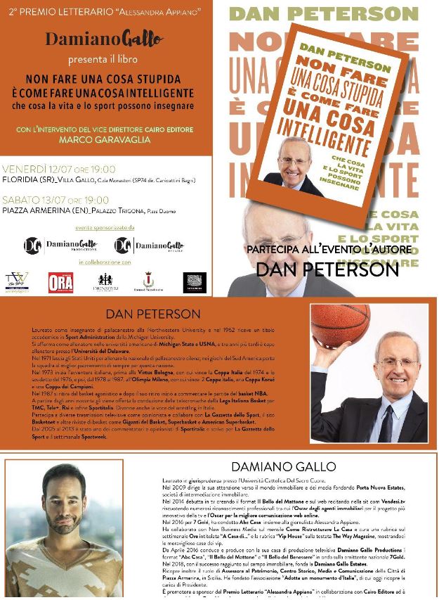 Gli incontri oprevedono l’intervento del vice direttore di Cairo Editore Marco Garavaglia, la presentazione di Damiano Gallo e naturalmente la presenza del protagonista Dan Peterson. I due appuntamenti sono programmati a Floridia, in provincia di Siracusa, venerdì 12 luglio alle 19, presso villa Gallo, e sabato 13 luglio alle 19 a Piazza Armerina, provincia di Enna, presso il Palazzo Trigona in piazza Duomo.